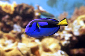 - Ciri khas: Tubuh biru terang dengan pola kuning pada sirip ekor dan garis hitam melengkung di badan. Ikan ini menjadi populer berkat karakter "Dory" dalam film animasi.